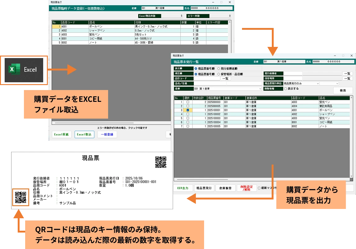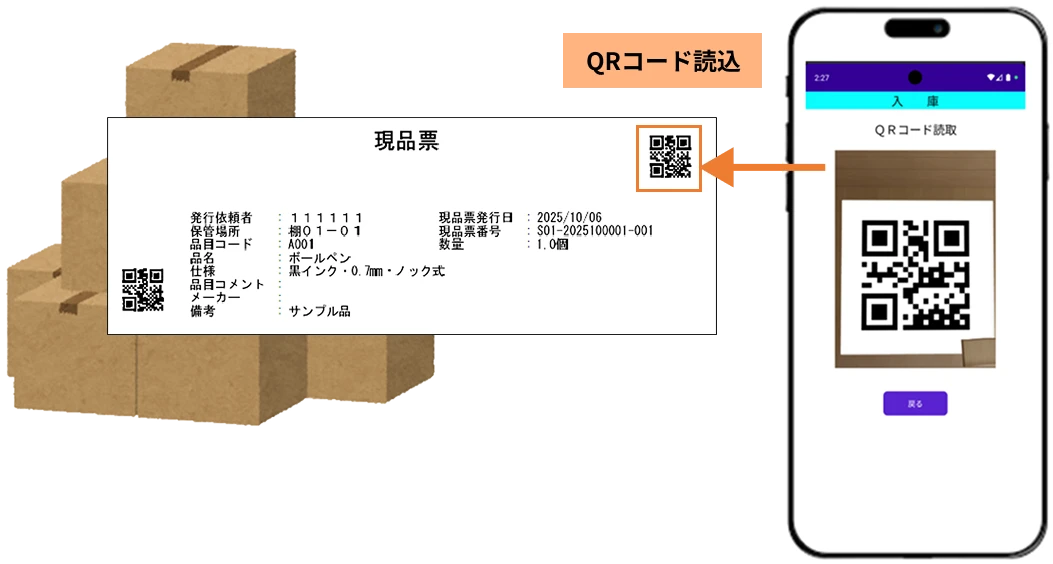 | 入庫処理 | 現品票のQRコードをバーコードリーダーで読込み、入庫処理を行います。 |