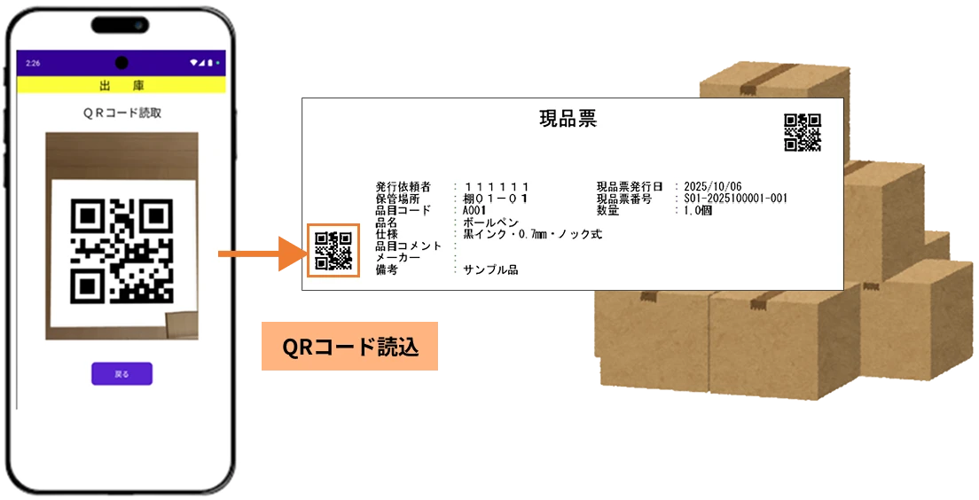 | 出庫管理 | 現品票のQRコードをバーコードリーダーで読込み、出庫処理を行います。 |