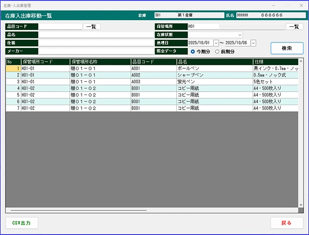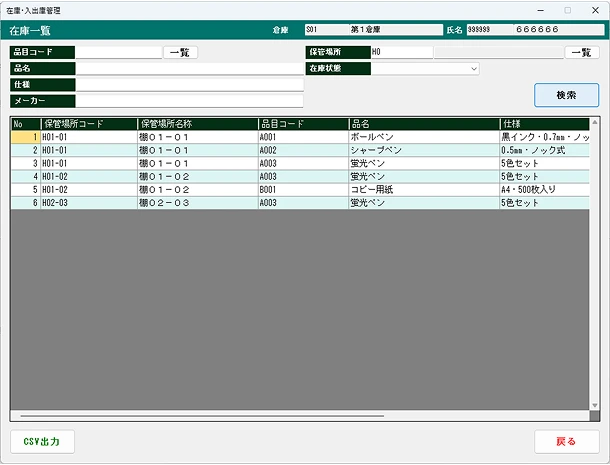 | 在庫入出庫一覧 | 在庫の入出庫履歴を確認します。 |