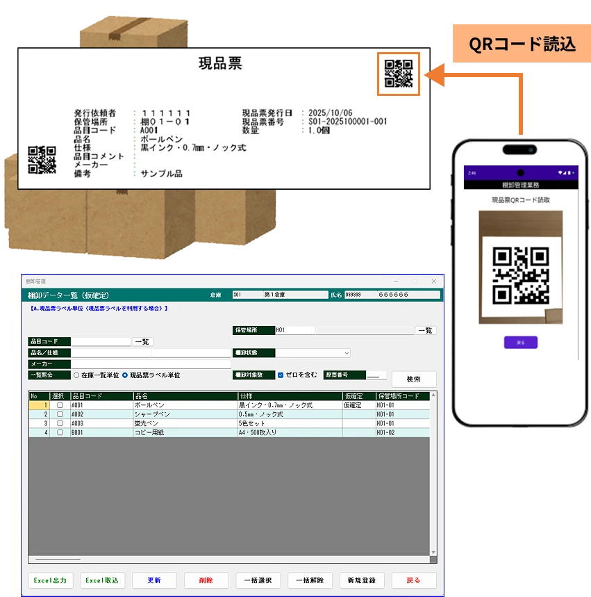 | 棚卸処理 | 現品票のQRコードをバーコードリーダーで読込み、棚卸を行います。 |